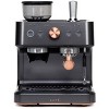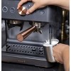 - Built-in conical burr grinder with 15 coarseness/fineness levels grinds directly into portafilter