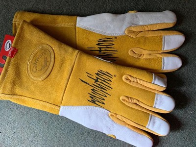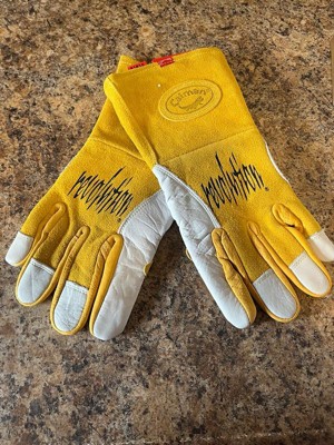 Welding Gloves, Welding Glove Application MIG, Stick, Leather Palm Material Cowhide, Glove Back Material Cowhide, Glove Length 13 in, Glove Leather Grade A, Thumb Style Keystone, Glove Cut Gunn - Full Back, Glove Color Family Beige, Cuff Gauntlet, Glove Size XL, Hand Left and Right, Color Tan, Cuff Material Cowhide, Design US Patented 3-D Kontour(TM) Pattern with Fourchettes, 1 Pair