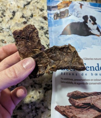 [This review was collected as part of a promotion.] Caledon Farms Beef Tendersticks are like something I have never seen before. They are extremely lightweight and have a texture that reminds me of spray foam insulation after it has dried. So, if you can imagine a rice cake and a slab of beef having a baby… these dog treats would be that baby. As for the taste, I have to assume that they taste good to our furry friends because my super picky dog gave his approval. At first introduction, he just kept smelling them over and over again. Once his investigation was complete, he decided these were good enough to eat. Now, believe me when I tell you, this dog is a very hard one to please. He rarely eats anything that was intended for dogs, instead, he wants nothing but people food... more specifically, he wants what's on your plate. So to see him eat these dog treats was not only surprising, but a huge relief too. I know that with these treats he is actually getting something that is healthy,nutritious, and made just for dogs. I will continue to feed these to my dog as long as he continues to eat them!