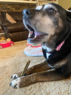 [This review was collected as part of a promotion.]  I received this product complementary in exchange for my honest review. As you can see, my dogs are incredibly enthusiastic about this product. They seem to genuinely enjoy them, and it assists with helping clean their teeth. If you are looking for a treat for your dog that helps with oral hygiene I would highly recommend.