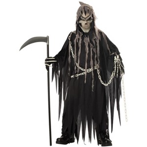 Your neighbors will gladly hand over their treats when you show up in this hair-raising Mr. Grim costume. This deadly costume is perfect for any child who wants to be the guardian of the underworld. Make this Halloween a scary one.