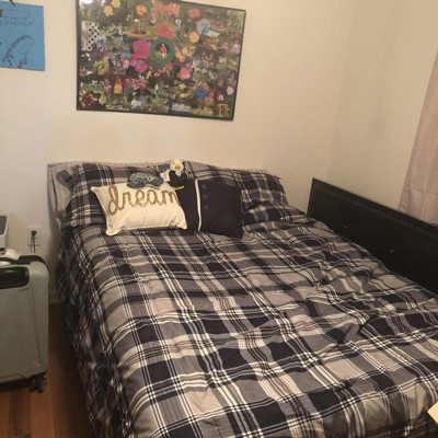 [This review was collected as part of a promotion.] I got this set for my new bed that I just recently got. I must say it’s now one of my favorites. The color scheme is dark navy/grey, white, and light grey. the design pattern is plaid and stripes. The set comes with a queen sheet and pillowcase set in light grey with white accent stripes, an accent pillow in navy with a white stripe and 3 clear buttons, and a set of 2 shams in the same navy/grey and white plaid as the comforter. The comforter itself is reversible with a light grey, navy/grey, and darker grey on one side, and on the reverse white replaces the darker grey. The sheets are soft to the touch and look to be well made. The comforter is light and fluffy, but warm and cozy. The shams and decorative pillow accent the set well. The color scheme is slightly masculine with the navy/grey, but could work well for either. This set would pair well with most decor and matches the blue color scheme of my bedroom well. I would definitely recommend this set! The only thing I were to change, if anything, would be to change the design of the accent pillow. Maybe instead of buttons which could potentially fall off in the future, add some sort of embroidery design in the future.