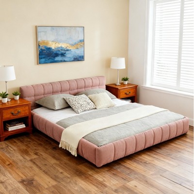 Elevate your bedroom with the ModernLuxe California King Upholstered Bed Frame! Featuring an elegant silhouette with soft white/pink chenille fabric and rich brown rubber wood legs, this bed instantly adds a refined, luxurious touch to your space. The 4-inch thick bed sides and foot create smooth, full lines for unique style and enhanced support/stability. Crafted with high-quality chenille (soft, skin-friendly, easy to clean) and solid rubber wood legs (durable, artistic), the bed's scientific internal structure ensures long-term stability (no shaking).
