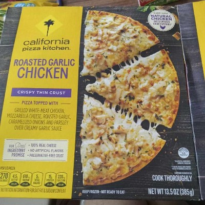 - One 13.5 oz California Pizza Kitchen Roasted Garlic Chicken Frozen Pizza with Crispy Thin Crust