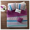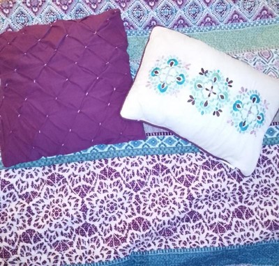 Give your bedroom a bohemian update with the Callie Boho Reversible Coverlet Set. Featuring gorgeous hues of purple, blue, turquoise and grey, this color combination enhances the intricacies of the global inspired pattern showcased throughout the coverlet, while the purple reverse complements the print on the top of bed. A decorative pillow with embroidered medallions adds the finishing touch and brings the whole look together.
