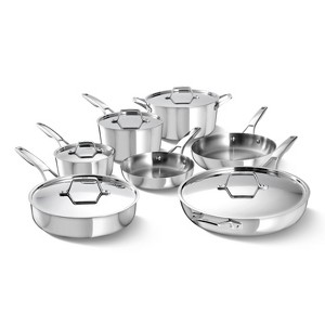 Designed for home chefs who value quality and performance, the Calphalon Premier Stainless Steel 12-Piece Set is built for precision cooking and lasting durability. Engineered with ultra-durable, non-toxic, 5-layer construction and heat-responsive aluminum core, this pan features Calphalon Turbo Temp technology and heats up to 30% faster, so you can getting cooking faster.* From weeknight dinners to gourmet creations, this professional 12-piece set has everything you need for crowd-pleasing meals. The brushed stainless steel finish adds a professional touch to your kitchen, while its oven-safe, all-stovetop compatibility ensures effortless cooking from start to finish. Cook with ease and bring restaurant-quality performance to you kitchen with Calphalon Premier Stainless Steel cookware. (*Calphalon Premier Stainless Steel vs. Cuisinart Professional Series Stainless Steel)
