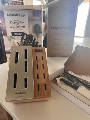 [This review was collected as part of a promotion.] Thank you Influenster and Calphalon for this complimentary 15 piece self-sharpening knife set, in exchange for my honest review. The knives came sharp right out of the box and the self-sharpening device should keep them sharp and ready for any cooking task. The knives are easy to grip and the nice contour of the handle keeps them from slipping in your hand. The wood block is attractive and the polished steel on top will blend nicely if you have stainless steel appliances in your kitchen. Each knife is separated with the perfect amount of space that makes it easy to grab a knife out of the wood block without disturbing the others. From using the knives several times, to self sharpen, you just press down lightly while pulling the knife out of the block. It's a smooth and easy process. Great looking and there is a knife for everything you need to cut, chop, or slice.