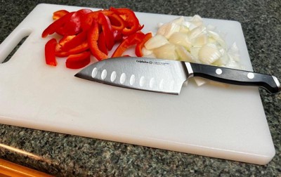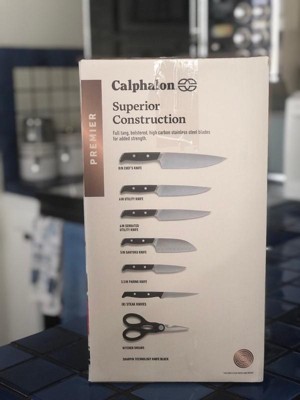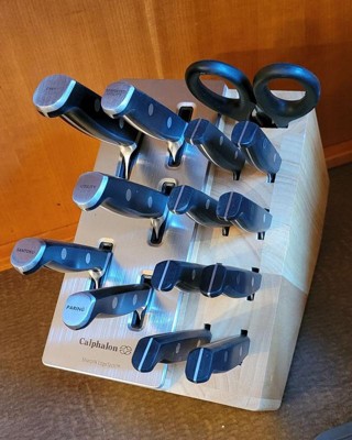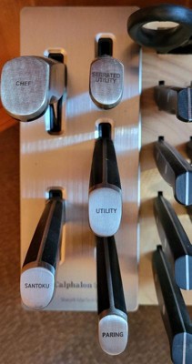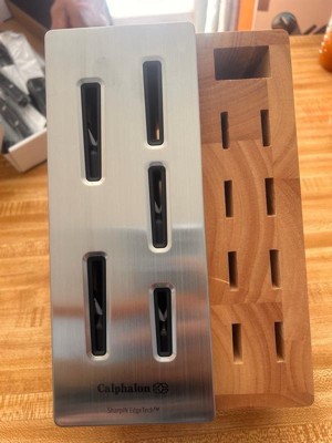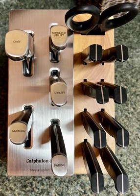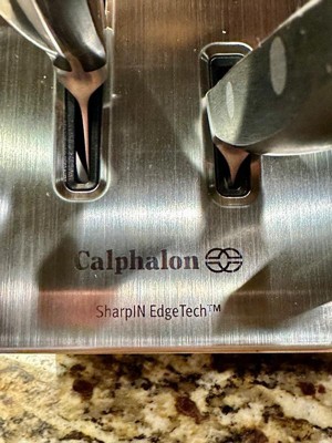 [This review was collected as part of a promotion.] I received this complimentary from @influenster and @calphelon in exchange for my honest review. I absolutely love this knife set. It’s very durable and the design of the sharp edge technology is great. They slide into the right slot with ease. If the pocket doesn’t fit the knife it won’t go in! Great safety feature. The knife itself weight to it. They cut like through a tomato like butter and the blades are sharp. It’s great the way the edge of the knife has imprinted on the handle tip the type it is. This has become my new favorite knife set. The larger knives have the sharpening ability built in. The steak knives do not. I definitely recommend having one of these sets.