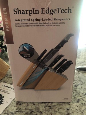 [This review was collected as part of a promotion.] So first off- what a beautiful knife set! I normally don’t like having things out on my countertop but I’ll happily make an exception for this! The SharpIn Edgetech is pretty amazing! I love knowing that I’m sharpening the knives every time I put them in & take them out of the block! But they’re already SUPER sharp- easily the sharpest knives I’ve ever owned. These knives are so well balanced and comfortable to work with. I don’t put them in the dishwasher, just hand wash and dry them before putting them back in the block. We are so pleased with this set, we’re buying another as a wedding gift- highly recommend