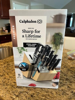 [This review was collected as part of a promotion.] Calphalon is a brand that I have been buying for years. Always known to me as being high quality products, the Premier 15 Piece Knife Set w/SharpIN Edgetech does not disappoint. Its sleek design look great on my counter. The set includes everything needed for most kitchen cooking projects. They are labeled so you know what knife you are pulling out. It’s also convenient having the knives housed in their own sharpeners. Slicing vegetables, meats, bread, and fruits is done with ease since these knives remain razor sharp. The knives slice as thin and accurately as my mandolin. Cleaning is no effort since you just need to rinse and dry off and replace them into the block. Housing them in the block is a definite safety feature as they’re not laying in a drawer where you can reach in and get cut. I would highly recommend this knife set, and look forward to using them every day! They may be a bit pricey, but they will last, therefore you will get your money’s worth.