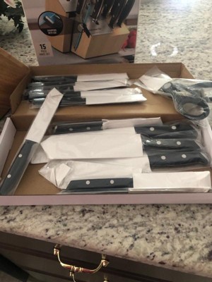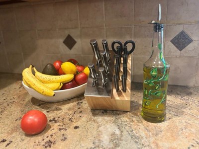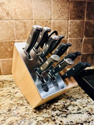 [This review was collected as part of a promotion.] So many great things to say about this knife set. Starting with just how nice it looks, classic but stylish, fits with any kitchen decor. The block is designed so that the knives are sharpened each time you place them back for storage. Each knife is labeled so that you can easily identify it before removing it. All of the knives came pre-sharpened and ready to use. This set also includes eight steak knives and a set of kitchen shears.