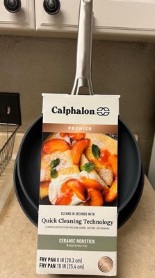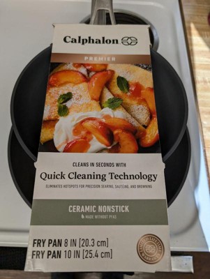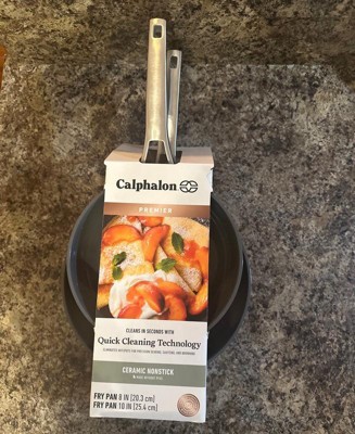 Embrace your inner gourmet, while elevating the look of your kitchen, with the Calphalon® Premier Ceramic Nonstick Frying Pan Set. Designed for home cooks, this fry pan set will inspire your most delicious culinary adventures. The durable cooking surface keeps food from sticking, and when you're finished cooking, cookware wipes clean in seconds with Quick Cleaning Technology.