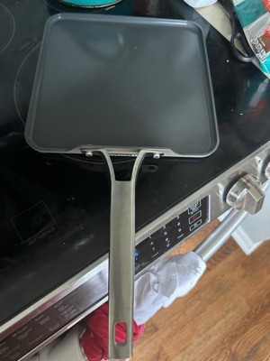 [This review was collected as part of a promotion.] This 11” square griddle from Calphalon is excellent. It’s durable, balanced and not too heavy. Heats evenly without sticking. Super quick and easy to clean. Great for searing, sautéing and browning.