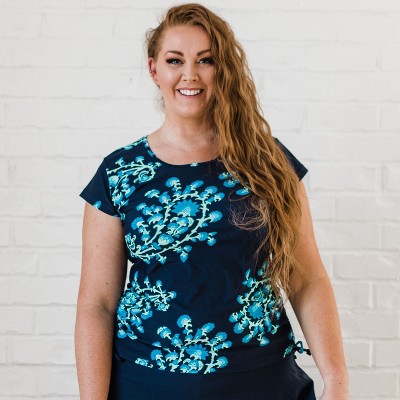 This loose fit swim top features a cap sleeve and round neckline. The tie hemline is flattering on every body type, and doubles as a functional way to prevent the swimtop from riding up in the water! Does not feature a Built-in Bra. UPF 50+ sun protection. Quick Dry. Sold as top only. Shop separate bottoms to complete your look!