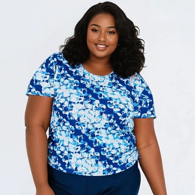 Jump into summer with the Adele Swim Top. This tight-fitting, short-sleeved beauty isn't just about making a style statement at the pool or beach; it's about confidence, comfort, and care. The side ruching celebrates your unique shape, giving you that added touch of flair, while the UPF 50+ protection ensures you can bask under the sun without a care in the world. Not a fan of built-in bras? No problem! Pair it with your favorite bra for that tailor-made fit. And when it's time to switch up the scene, this top goes from making waves at the beach to turning heads on the boardwalk. So why wait? Dive in, look great, and feel even better. Pair it with the perfect swim bottom and you're all set for sun-soaked adventures.