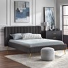 Transform your bedroom from ordinary into a Mid-Century modern haven with the Cambria Queen Size Platform Bed by Lifestyle. The perfect blend of comfort and luxe style, offers a welcoming sleek silhouette. Fully upholstered in a charcoal gray boucle fabric with a soft to the touch thick texture that provides all around coziness. The headboard and foot board feature sleek vertical channel tufting, highlighting refined detail, while the ends of the headboard fashion a subtle inward slant that puts a modern spin on a classic wingback design. Gold-tone outward angled metal legs accentuate the modern look that completes a bed that beckons a quite escape.