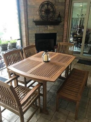 Bought as an outdoor dining set for our back patio. Lovely, solidly built. Easy to assemble (the table is a two-person job). The wooden slats help with water drainage outdoors. The bench is a nice alternative to a six-chair set. Recommended.