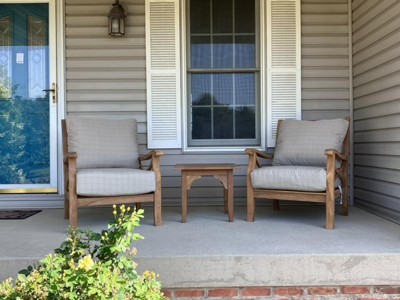 We had our deck renovated at this summer we had it stained. After many hours of research we chose Abbington teak patio set with blue cushions. The set is sturdy and well made. It is absolutely stunning!!!