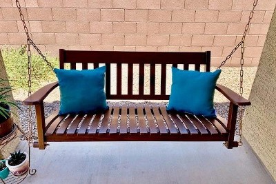 I have always wanted a porch swing but I never thought I would have one since I live in the southwest and don’t have a cozy front porch. But while being at home so much during the COVID-19 quarantine, I decided why not get the porch swing I always wanted! My husband easily assembled it, the instructions were simple to follow and all of the hardware was included. The porch swing is made with quality craftsmanship. I didn’t realize before I started looking for porch swings that I was actually quite picky in what I was looking for and this specific swing was the only one I found that met my specific criteria. I initially found this swing on Home Depot’s website but they were out of stock. I loved the look and design of this swing so much that I had to find out the manufacturer of this swing so that I could try to find it on their website. Of course when I found them, the website was temporarily shut down because of the covid lockdown. I was so bummed but I kept checking back over the next couple months, and sure enough, the website was back up and running! My porch swing was in stock and I was so excited! Shipping was quick and it arrived in good condition. The swing is comfortable to sit in and I love that the armrests are wide enough to rest your arm and set a drink on. I appreciate that the chains on the swing don’t go through the armrest like a lot of other porch swings. This swing is big enough and sturdy enough to hold my husband and me as well as our 4 y.o. daughter.