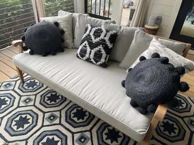 The daybed sofa is a good fit for our covered space. It is a little shorter than others like it so the smaller size was a bonus for us, but the depth still gives plenty of room to sit or nap. The teak wood is smooth and had a nice finish as shown in the mfg. photo. The back pillows are a little flat but hoping they will fluff up over time. The fabric also seems like it will be easy to wipe off.