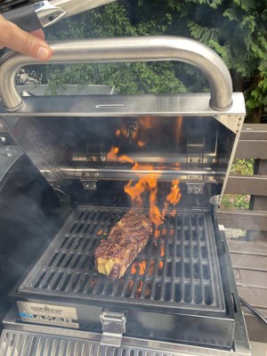 Description says, “instantly vaporizes grease drippings”. Think how that actually works… I think this grilled is a flawed design. The actual grill and hot plate are so close together compared to a regular gas grill. So when you cook anything with a fat content and it drips down it immediately becomes a grease fire. Not a big deal on normal grill, but since there really is no space the flames engulf your food. Also, doesn’t help to close the lid to put out grease fire because too much airflow. If you keep to chicken breast and vegetables works great.