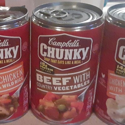 - Campbell's® Chunky® Soup: One (1) 15.25 oz microwavable bowl of Campbell's® Chunky® Beef Soup with Country Vegetables