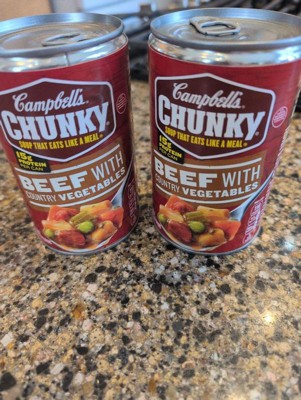 Campbell's Chunky Beef Soup with Country Vegetables isn't just tasty?it's made to work as hard as you do. With never-ending big flavors and bold ingredients, this soup is capable of fueling even the heartiest appetite. This ready-to-eat beef vegetable soup is crafted with big chunks of beef and hearty veggies like carrots, celery, peas and potatoes to create a big-flavored recipe that satisfies and fills you up. Each bowl has 12 grams of protein. It Fills You Up Right. Just open the soup bowl and pop it in the microwave when you're hungry and crunched for time. Whether you're looking for quick and easy to microwave soup for home or something to take on the go, Campbell's has you covered. Enjoy Campbell's Chunky Beef Soup With Country Vegetables?Soup That Eats Like a Meal.