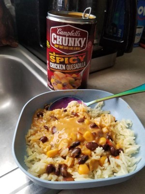 Campbell’s Chunky Spicy Chicken Quesadilla Soup brings the zesty taste of the Southwest to a fill-you-up, ready-to-eat soup. With mouth-watering flavors and bold ingredients, Campbell's Chunky Soup is capable of fueling even the heartiest appetite. This chicken soup is crafted with pieces of chicken meat without antibiotics, beans, corn, green and red peppers, and cheese loaded into an appetizing and spicy tomato puree. Just pop this ready to eat soup in a microwave-safe bowl, heat and enjoy. Each can has 18 grams of protein. It Fills You Up Right.
