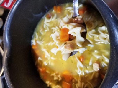This soup seems to be heartier and more filling than the same soup with rice. Nice big chunks of carrots and a good portion of noodles. Also, it's quite tasty and not at all salty like some chicken coups can be.