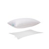 This pillow is filled with care in Canada. The shell is crisp 260 thread count cotton. The fill is 575 loft goose down. Down is made up of tiny, fluffy clusters, so down pillows are very soft, sinky, and squishy.