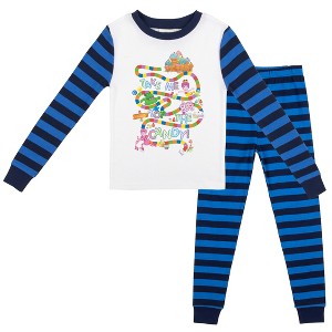 Bring some sweet fun to bedtime with this boy's 2-pack Candyland pajama set. Featuring a white crew neck long sleeve tee with colorful striped sleeves and a vibrant Candyland board graphic, plus matching black and blue striped pajama pants, this cozy set is perfect for playful dreams. Made with soft cotton and polyester, it delivers comfort and durability. Machine wash it on cold with like colors and tumble dry low heat for easy care.