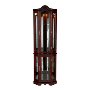 Sold as a set of two boxes. Display your collectables with pride in this lighted curio cabinet. Mirrors are present on both back edges to enhance the lighting of your items and give more visual depth. The rich mahogany finish complements the simple straightforward design with tall vertical panes and decorative arch top. Two adjustable shelves are present in the upper cabinet that can be raised, lowered, or removed to suite your needs. Additionally, the lower cabinet also contains one adjustable shelf. This lighted corner curio is sure to become a cherished piece of furniture in your home.