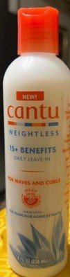 Cantu Weightless Daily Leave-In Cream is a daily leave-In cream provides more than 15 unique benefits for scalp and strands including heat protection up to 482° F/250° C and protection from environmental damage. Made with fair trade blue agave known to help promote stronger, smoother, healthier looking hair. This cream helps prevents breakage, adds volume, strengthens and conditions dry strands, refreshes curls, adds shine, detangles, softens and smooths. Cantu Weightless is vegan, suitable for sensitive skin, and free from harsh ingredients.