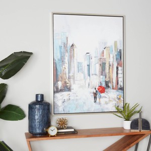 This wall art exude natural beauty and sophistication in both color and composition. Showcase your personality and turn your walls into an art gallery with this impressive wall art. Striking and whimsical, this couple in city wall art will surely bring your walls to life and add personality to your interior. This item ships in 1 carton. Can be hung vertically using the sawtooths on the back; nails and screws not included. Suitable for indoor use only. This item ships fully assembled in one piece. This is a single multi colored canvas wall art. Contemporary style.
