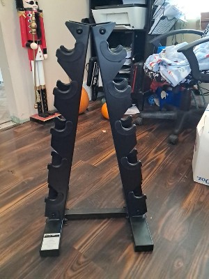 Great weight rack and the price is very affordable. We had a rack that came with the weights and it kept toppling over. Found this and tried it ... perfect! Fits in a small corner; holds all of the weights and is very sturdy. Strongly recommend this product