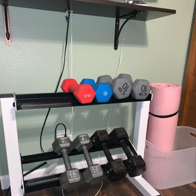 - COMPACT DESIGN - This dumbbell rack features a compact two-tier storage space. A flat top rack and a precision angled lower rack allow easy access to dumbbells.