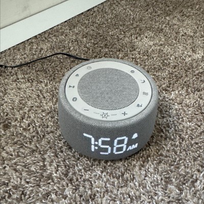 Sound Round is wrapped in fabric and features an adjustable brightness clock display. The gentle wake alarm allows you to select different wake up tones and set the volume louder or softer and a snooze options for extra zzzz's. There's an option to turn on an ambient light ring for a warm glow around the base and the buttons light up when pressed so you can easily see them in the dark.