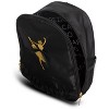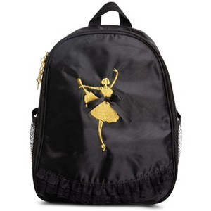 Ballet Bow Backpack The Ballet Bow Backpack is perfect to go from class to class. Adjustable shoulder straps provide a customized fit for every dancer. Ballerina applique and lace trim create an elegant style. Featuring a large inner pocket and two outer mesh pockets to store water bottles and other accessories. Two metal ballerina zipper pulls for added detail. Product Features: