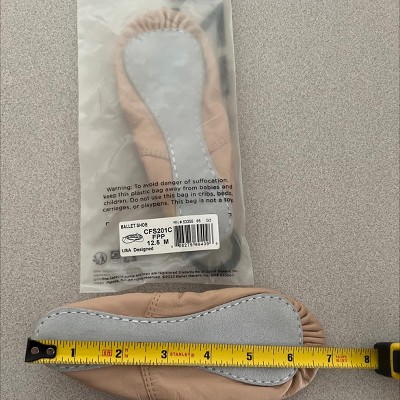These ballet shoes look and feel like they are good quality, but the sizing is wildly inaccurate. I ordered a full size up, based on the other reviews, but they still came in too small. The Capezio size chart shows a 12.5 measures 7.5”. The 12.5 I received messes exactly 7”. They are also very narrow, my child doesn’t have very wide feet, but I know these won’t even squeeze on.