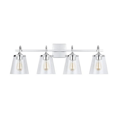 The wide cone seeded glass on this 4-Light Vanity is suspended by a simple arched arm and tapered metal cap makes it a timeless shape for any bathroom vanity. APPLICATIONS: Rated for damp locations, perfect for bathrooms and powder rooms. Simply arched arms give way to conical seeded glass in this aged brass piece. EASY TO INSTALL: Replacing an existing fixture is easy with the included instructions and can be finished in as little as 15 minutes with a few simple hand tools. Install with sockets opening either upward or downward. VERSATILE: Dimmable and LED/CFL/Incandescent compatible, uses four 100-Watt (max) E26 medium base bulbs (Not Included) RELIABLE: Includes 1-Year Full Manufacturer's Warranty. Warranty: 1 Year Room Recommendation: Bathroom/Powder Room Mounting Direction: Up or Down Shade Included: Yes