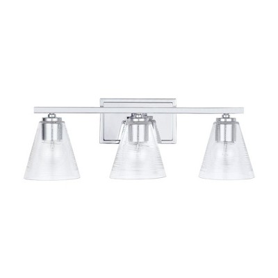 The architectural detailing of the fluted glass of this 3-Light Vanity creates brillinat shine for a luxe look that is effortlessly elegant. Finished , this fixture is available as a 2-light, 3-light or 4-light. APPLICATIONS: Rated for damp locations, perfect for bathrooms and powder rooms. The modern, segmented cone shaped clear glass intensifies the bold cylindrical features adorned in antique brass EASY TO INSTALL: Replacing an existing fixture is easy with the included instructions and can be finished in as little as 15 minutes with a few simple hand tools. Install with sockets opening either upward or downward. VERSATILE: Mounts bulbs up or down, dimmable and LED/CFL/Incandescent compatible, uses three 100-Watt (max) E26 medium base bulbs (Not Included) DIMENSIONS: 24 inchW x 9.5 inchH x 7 inchE; includes 1' of wire. RELIABLE: Includes 1-Year Limited Manufacturer's Warranty. Warranty: 1 Year Room Recommendation: Bathroom/Powder Room Mounting Direction: Up or Down Shade Include