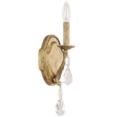 Our beautifully crafted Blakely 2-light wall sconce lends elegance and sparkle to the bath, hallway or stairway. The quatrefoil-shaped backplate supports a pair of artistically scrolled arms. Faceted crystal embellishments dangle from the tips of each arm, exquisitely balanced by a teardrop crystal at the center. Finished in rich Antique Gold, this wall sconce evokes the grandeur and opulence of an old-fashioned fixture. Warranty: 1 Year Room Recommendation: Powder Room/Foyer/Entryway/Kitchen/Bathroom/Living Room/Dining Room/Bedroom Mounting Direction: Up