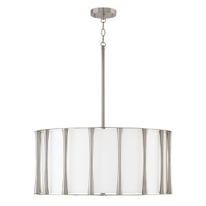 Soft and statement making, the Bodie Pendant adds a layerof luxury to any space. The tapered columns in Brushed Nickel frame the tailored fabric shade, creating a sophisticatedluminaireto matchyourstyle. DIMENSIONS: Overall: 24.5"W x 11"H; Adjustable Hanging Height: 18" - 63.5"; Includes 12" of chain and 120" of wire; Rods Included 6"(1), 12"(1) & 18"(1)L DETAILS: The tapered metal accents surround the white fabric drum shade and frosted acrylic diffuser. FINISH: With a soft, visual texture, the Brushed Nickel finish is a light-medium grey with slightly warm undertones. BULBS: Designed to be dimmable and LED/CFL/Incandescent bulb compatible, this fixture uses 4 - 100 Watt (max) E26 Medium base bulbs (not included). FEATURES: Rated for dry locations; includes a 1-Year Manufacturer Warranty. Mounting Direction: Horizontal Canopy Included: Yes Canopy Diameter: 5.00 Chain Length: 12.00 Rod Length(s): 1-6, 1-12, 1-18 Shade Included: Yes