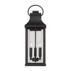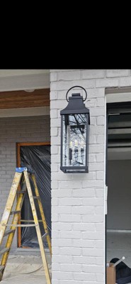 Transitional meets modern with the Bradford Large Wall Lantern. The bold lines and an oversized ring in a Black finish adds classic curb appeal to your home. Part of our Rain or Shine Collection and backed by our five-year warranty. DIMENSIONS: Overall: 8"W x 24"H x 9.75"E; Backplate: 4.75"W x 7.5"H x 1"E DETAILS: The tapered top and oversized ring paired with Clear Glass panels create a transitional and modern look. Bottom is open for easy access to bulb. FINISH: Part of the Rain or Shine series, the Black finish is a neutral, dark tone with a slightly coarse texture. BULBS: Designed to be dimmable and LED/CFL/Incandescent bulb compatible, this fixture uses 3 - 60 Watt (max) E12 Candelabra base bulbs (not included). It's shown here with a B10 lamp. FEATURES: Rated for Wet locations; includes a 5-Year Manufacturer Warranty Against Rust and Fading. Mounting Direction: Up Back Plate Height: 7.50 Back Plate Width: 4.75 Shade Included: Yes Shade Dimensions: 6.75 x 14.75