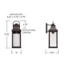 Transitional meets modern with the Bradford Low Light Small Wall Lantern. The bold lines and an oversized ring in a Black finish adds classic curb appeal to your home. This fixture is designed for minimal light emissions and is part of ourRain or Shine Collection and backed by our five-year warranty. DIMENSIONS: Overall: 6"W x 17.25"H x 7.5"E; Backplate: 4.75"W x 6.25"H x 0.75"E DETAILS: The tapered top and oversized ring paired with Clear Glass panels create a transitional and modern look. The Night Sky friendly fixture is designed for minimal light emission. Bottom is open for easy access to bulb. FINISH: Part of the Rain or Shine series, the Black finish is a neutral, dark tone with a slightly coarse texture. BULBS: Designed to be dimmable and LED/CFL/Incandescent bulb compatible, this fixture uses 1 - 7 Watt (max) GU10 Twist Lock base bulbs (not included). It's shown here with a GU10 lamp. FEATURES: Rated for Wet locations; includes a 5-Year Manufacturer Warranty Against Rust an