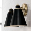 Bring a bold, modern look to traditional bath lighting with the Bradley 2-Light Vanity. The Aged Brass accents and crisp metal shades bring distinct style, while the Matte Black exterior and White interior shade finishes create down-light illumination that is perfect for powder rooms or focused task lighting. DIMENSIONS: Overall: 15"W x 9"H x 7.5"E; Backplate: 5"W x 5"H x 1"E. DETAILS: Metal shade with white interior for optimal light output. Available in 2-Light and 3-Light options. FINISH: A classic two-tone combination, this finish creates instant personality and character from playful to dramatic to refined. Aged Brass is a warm, honey-gold with fine brushed texture, and Matte Black is a neutral, dark, flat black. BULBS: Designed to be dimmable and LED/CFL/Incandescent bulb compatible, this fixture uses 2 - 100 Watt (max) E26 Medium base bulbs (not included). It's shown here with an A15 lamp. FEATURES: Rated for damp locations; includes a 1-Year Limited Manufacturer Warrant