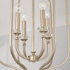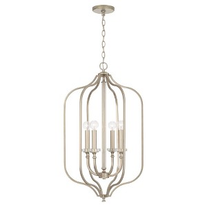 The soft curves of the Breigh Foyer put a romantic twist on the lantern silhouette. The Brushed Champagne finish adds a subtle texture and glistens off the acrylic accents for a style with understated glamour. DIMENSIONS: Overall: 18"W x 31.75"H; Adjustable Hanging Height: 35.75" - 157.75"; Includes 120" of chain and 180" of wire. DETAILS: The acrylic column and bobeches on the candle sleeves add sparkle and create the look of crystal. FINISH: A light gold with silver undertones, this hand-applied, painted finish has a subtle shimmer and brushed visual texture. BULBS: Designed to be dimmable and LED/CFL/Incandescent bulb compatible, this fixture uses 4 - 60 Watt (max) E12 Candelabra base bulbs (not included). It's shown here with a G16 lamp. FEATURES: Rated for dry locations; includes a 1-Year Manufacturer Warranty. Mounting Direction: Up Canopy Included: Yes Canopy Diameter: 5.00 Chain Length: 120.00
