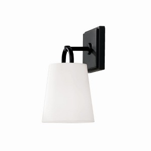 Embodying true minimalist form, the Brody Sconce brings sleek, simplified style. The Matte Black finish enhances the classic look of the white fabric shade to deliver sophisticated, less-is-more design. DIMENSIONS: Overall: 6"W x 11"H x 6.5"E; Backplate: 5"W x 5"H x 1"E. DETAILS: Crisp fabric shade accents the arch detail for a sophisticated, simplified style. FINISH: Matte Black is a powder coated, muted, neutral tone. BULBS: Designed to be dimmable and LED/CFL/Incandescent bulb compatible, this fixture uses 1 - 100 Watt (max) E26 Medium base bulbs (not included). It's shown here with a G25 lamp. FEATURES: Rated for damp locations; includes a 1-Year Limited Manufacturer Warranty.