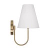 Sophisticated curves create chic style in the Julia Sconce. The Matte Brass finish adds a subtle shimmer to the sleek, arched arm, perfectly complementing the crisp, tapered white shade complete with a glass diffuser for a fresh take on transitional look. DIMENSIONS: 7.50"W x 14"H x 9.75"E / DETAILS: The tall, tapered fabric shade creates a chic complement to the arched Matte Brass arm. The glass diffuser invites a soft glow when lit. / FINISH: Matte Brass is a light, honey-toned gold with a slightly shiny finish that's smooth to the touch. / BULBS: Designed to be dimmable and LED/CFL/Incandescent bulb compatible, this fixture uses 1 - 60 Watt E12 Candelabra base bulb (not included). / FEATURES: Rated for Damp Locations; Includes a 1-Year Manufacturer Warranty.. ,