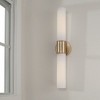 Modern details and an elongated silhouette create the Parson Dual Sconce. The cylindrical Soft White glass shades evoke a sophisticated glow, while the Matte Brass band adds a touch of shine. DIMENSIONS: 25.25"W x 5"H x 4.50"E / DETAILS: The elongated Soft White glass and Matte Brass finish bring sophistication to any space. Option to hang with a vertical or horizontal orientation. / FINISH: Matte Brass is a light, honey-toned gold with a slightly shiny finish that's smooth to the touch. / BULBS: Designed to be dimmable and LED/CFL/Incandescent bulb compatible, this fixture uses 2 - 100 Watt (max) E26 Medium base bulbs (not included). / FEATURES: Rated for Damp Locations; Includes a 1-Year Manufacturer Warranty.. ,